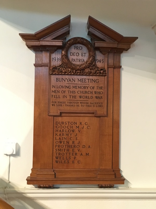 DEO ET PATRIA 1939 1945 BUNYAN MEETING IN LOVING MEMORY OF THE MEN OF THIS CHURCH WHO FELL IN THE WORLD WAR FOR THOSE THROUGH WHOSE SACRIFICE WE LIVE - THANKS BE TO THEE O LORD |
