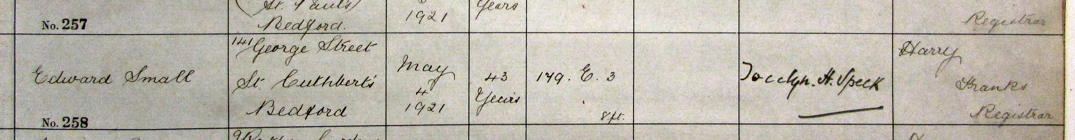 Note: The attached image refers to the date that Captain Small died as 28th April 1931, however, that is incorrect as the correct date is the 28th April 1921, which is supported by the burial record entry 258 of page 26 of Burial register No 24.