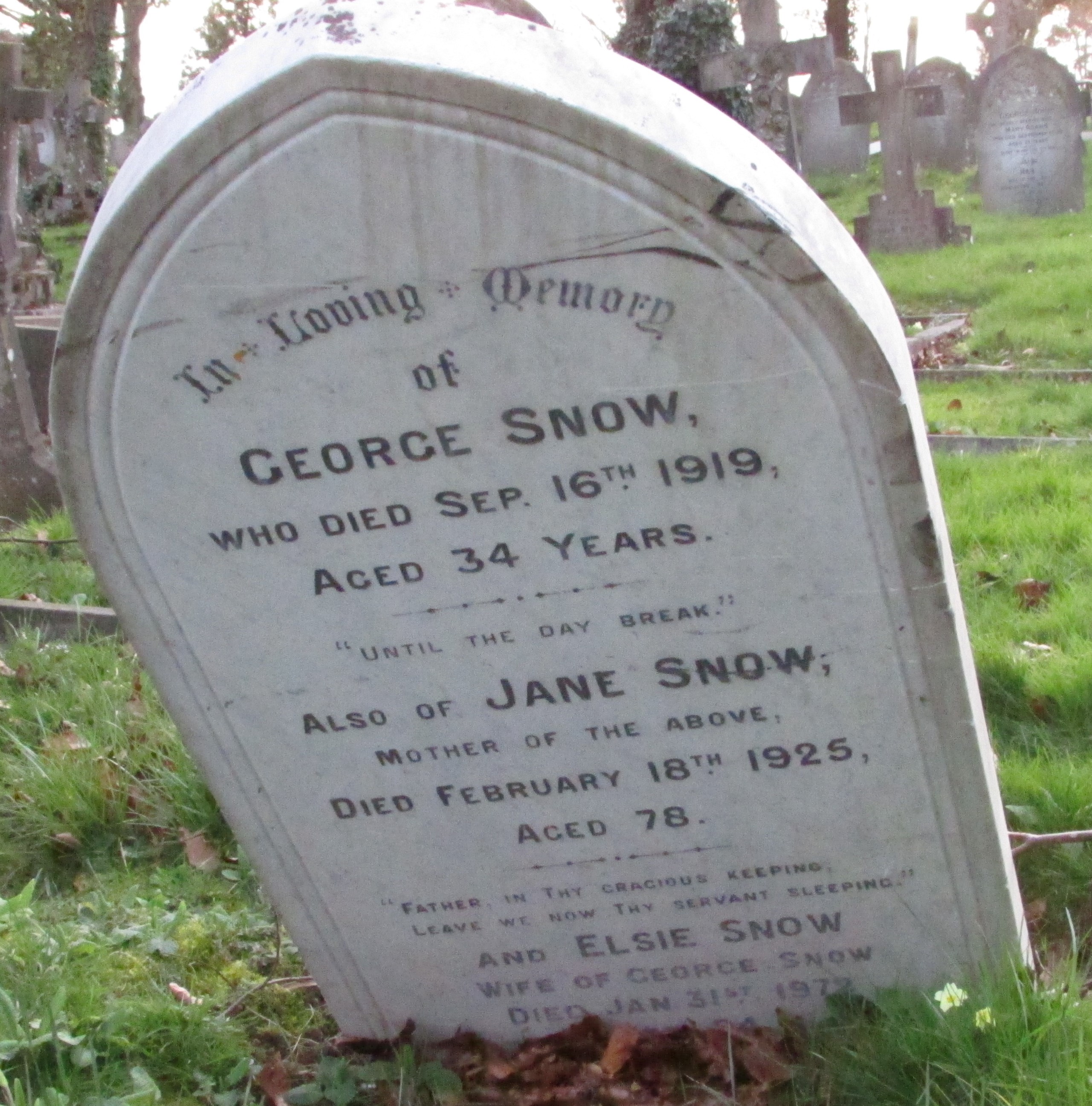 Private 41170, 2nd Battalion, Duke of Cambridge's Own (Middlesex Regiment). Died Wednesday 17th September 1919 [Gravestone states 16th]. The burial records state that Private Snow was buried at Bedford Cemetery 17th September 1919. The family headstone shows that Private Snow died Tuesday 16th September 1919. Grave I.4. 70.