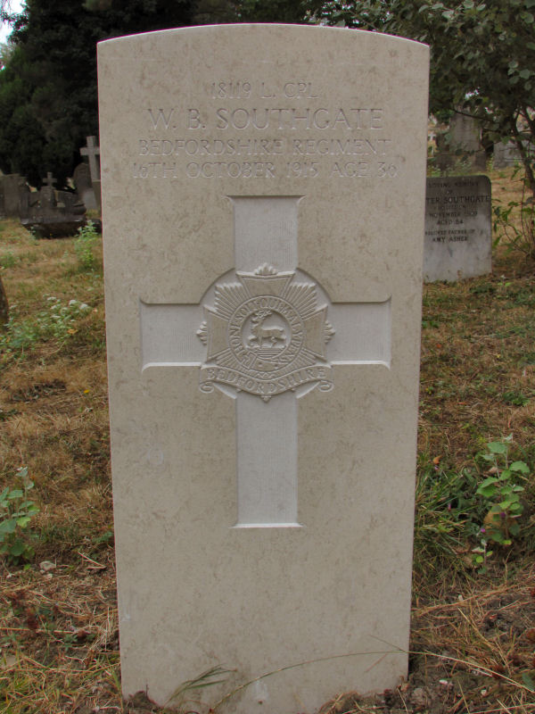Lance Corporal 18119, 2nd Bn., Bedfordshire Regiment. Died of wounds on Saturday 16th October 1915. Aged 36. Born, resident and enlisted Bedford. Son of Walter and Pheobe Southgate. Grave L. 157.