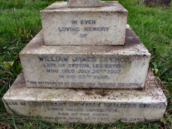 Lieutenant, 2nd Battalion, Leicestershire Regiment. Died Tuesday 8th September 1914. Aged 43. Buried Friday 11th September 1914. Home address recorded as 38, Alexander Road, Holy Trinity, St Paul's, Bedford. Inscription on the memorial stone: "His Worth Too Great His Faults To Few Too Tell". Grave H.5. 274.