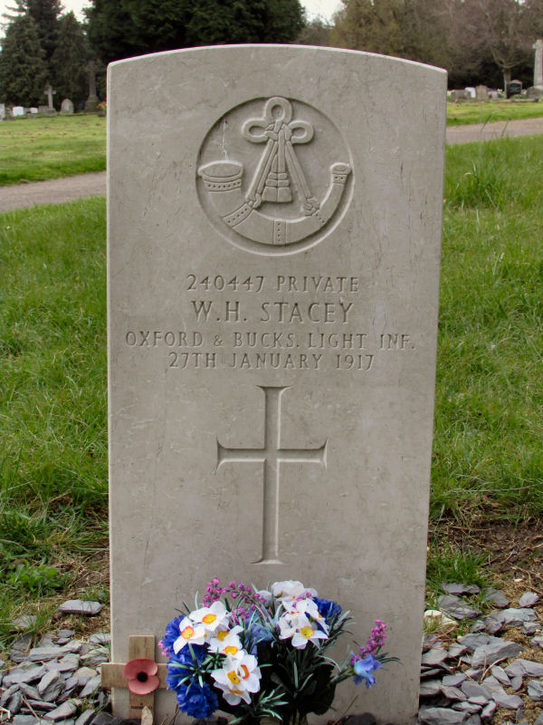 [Listed as W H Stacey on CWGC] Private 240447, 10th Battalion, Oxford and Buckinghamshire Light Infantry. Died Saturday 27th January 1917. Aged 37. Enlisted Camberwell, Surrey, resident Wandsworth, Surrey. Formerly 7400, Royal Berkshire Regiment. Grave G. 127.