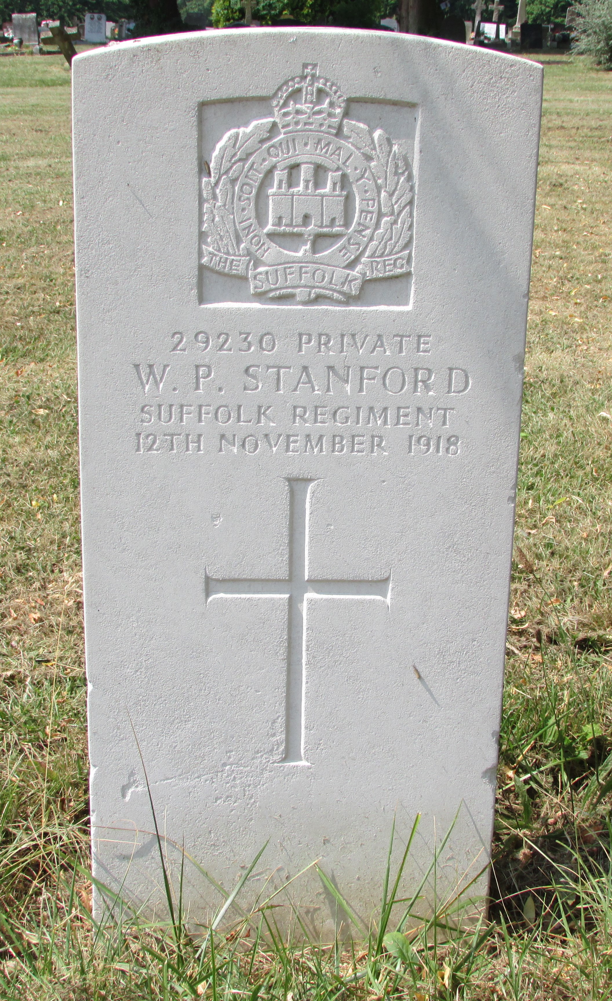 Private 29230, 10th Battalion, Suffolk Regiment. Died Tuesday 12th November 1918. The burial records state that Private Stanford was buried at Bedford Cemetery Tuesday 12th November 1918. Grave G. 321.