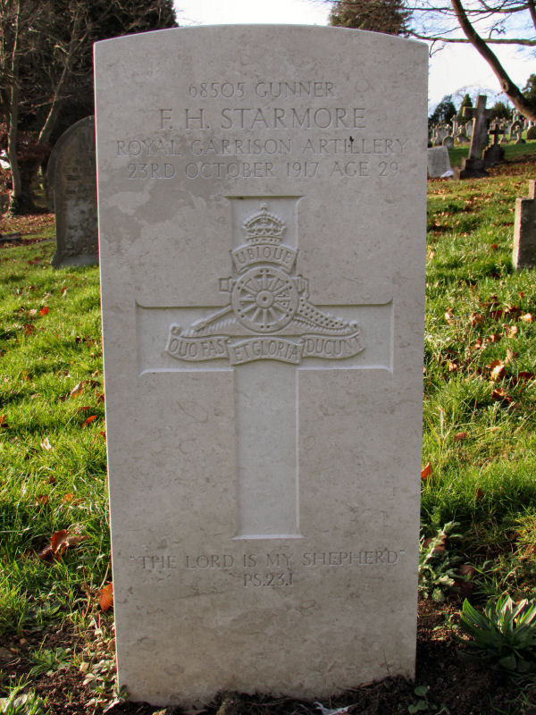 Gunner 68505, 154th Hampshire Heavy Battery, Royal Garrison Artillery. Died at Cambridge Military Hospital, as a result of wounds received in France, Tuesday 23rd October 1917. Age 29. Born and enlisted Bedford, resident Rugby. Son of the late Alfred and Elizabeth Starmore, of Bedford; husband of Henrietta Jane Starmore, of 11, Wellesley St., Hamilton, Ontario, Canada. Grave H/5. 199. See also Bedford, All Saints.