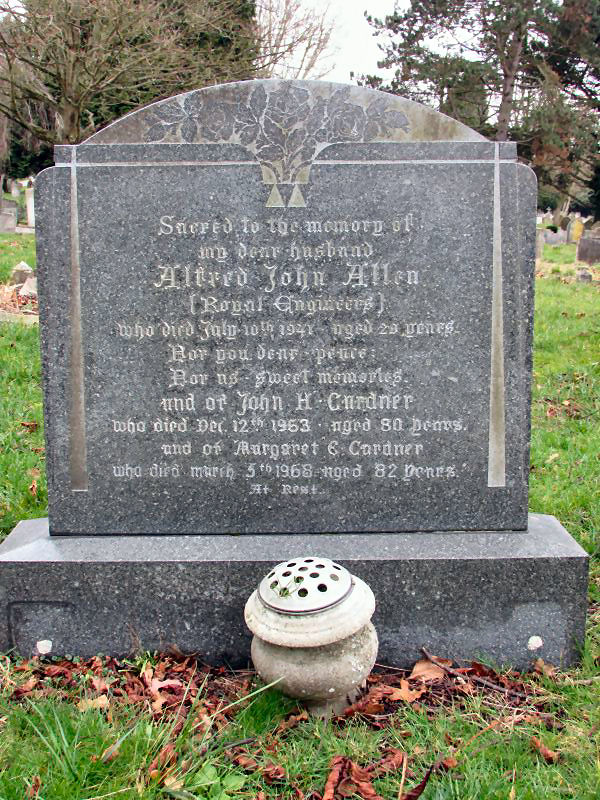 Sapper 2132123, 757 Field Co, Royal Engineers. Died as a result of an accident 10 July 1941. Aged 29. Born 6 October 1911 and resident Bedfordshire. Son of Harold and Annie Allen; husband of Grace Ena Allen, of Bedford. In the 1939 Register he was married to Grace Allen, a Butcher's Salesman, resident Ivydene, Ivy Lane, Bedford R.D., Bedfordshire. Buried in Bedford Cemetery on the 15 July 1941. Sec. I. Grave 1051.