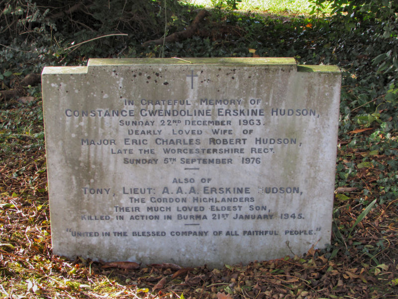 Lieutenant 179848, Gordon Highlanders attached to 2nd Battalion, Worcestershire Regiment. Died as a Japanese Prisoner of War Sunday 21st January 1945. Aged 24. Son of Maj. Eric Charles Robert Hudson, and of Constance Gwendoline Hudson (nee Erskine), of Bedford. Buried in TAUKKYAN WAR CEMETERY , Myanmar. Lieutenant Hudson is also commemorated on his parent’s grave at Bedford Cemetery Bedfordshire (now known as Bedford Cemetery Foster Hill Road Bedford) Grave reference - K. 267