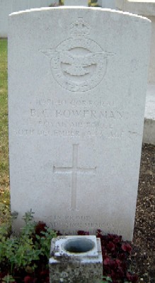 Corporal 1198140, Royal Air Force Volunteer Reserve. Died Thursday 30th December 1943. Aged 23. Son of Raymond Bevill Bowerman and Ethel Florence Bowerman; husband of Mary Emma Bowerman, of Bedford. Section I. Grave 361.