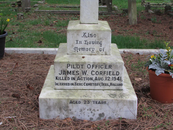 Pilot Officer 65533, 21 Squadron, Royal Air Force Volunteer Reserve. Died 12 August 1941. Aged 25. Son of William Wilmot Corfield and Gladys Corfield, of Bedford. Buried in TEXEL (DEN BURG) CEMETERY, Noord-Holland, Netherlands. Plot K. Row 3. Grave 55. Commemorated on family grave in bedford Cemetery, Foster Hill Road, Bedford. Section Q. Grave 426.