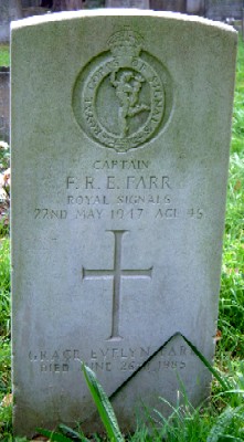 Captain 250221, Quartermaster, Royal Signals. Died Thursday 22nd May 1947. Aged 45. Son of Frederick Arthur and Sarah Farr; husband of Grace Evelyn Farr, of Bedford. Sec. Q. Grave 770.