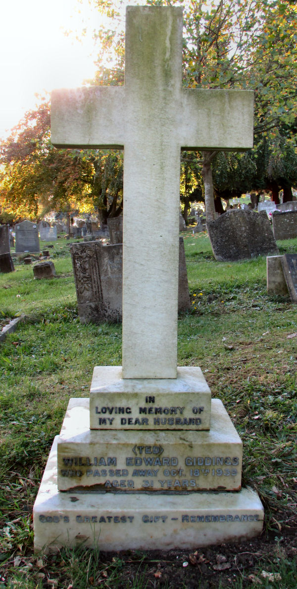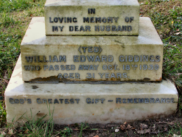 Sergeant 2214166, Royal Corps of Signals. Died on service in United Kingdom Wednesday 18th October 1939. Aged 31. Born and resident Bedford. Son of William and Emily Giddings, of Bedford; husband of Amy Giddings, of Bedford. In the 1911 census he was aged 3, born bedford, son of William Henry and Emily Giddings, resident 35A, Priory Street, Bedford, Bedfordshire. Sec. M. Grave 323.