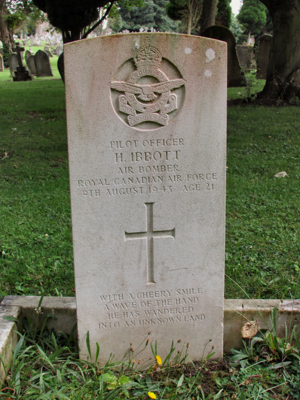 Pilot Officer (Air Bomber) J/24024, 82 OTU, Royal Canadian Air Force. Took off from Ossington on a daylight cross country exercise an engine failed at low level and the Wellington crashed between Newark and Retford. Monday 9th August 1943. Aged 21. Born 2 August 1922. Son of Arthur W. P. Ibbott and Caroline Ibbott, of Winnipeg, Manitoba, Canada. Sec. H. Grave 838.