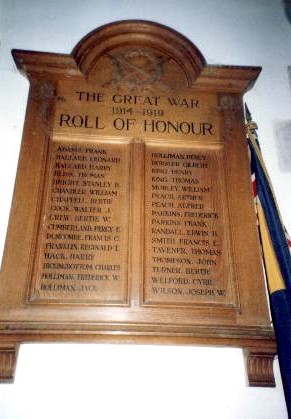 The War Memorial is located inside the Parish Church. There is a new War Memorial on the Green, but this has no names engraved upon it.