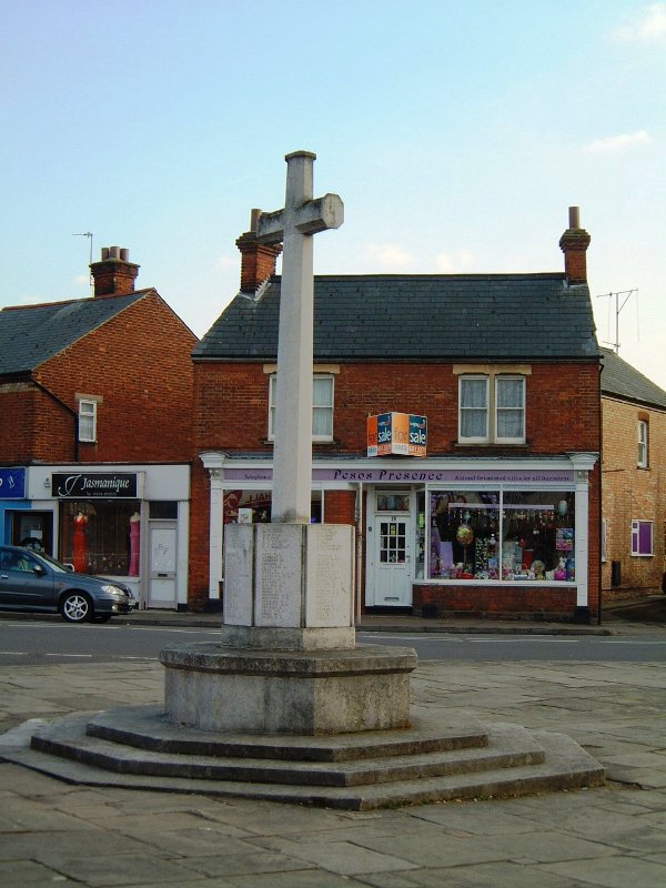 High Street. The memorial takes the form of a cross mounted on an octogonal