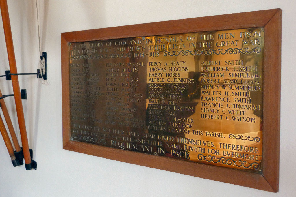 The Woburn Sands St Michael's memorial is to be found within St Michaels's Church, Church Road, Aspley Heath and covers the parish and is not the same as the Woburn Sands memorial although there are duplication of names, It takes the form of a brass plaque within a wooden frame and is fixed to an interior wall of the church. There are 47 names listed for World War 1 only. See also Woburn Sands and Aspley Heath War Casualties and the Woburn Sands War Memorial and also the main Woburn Sands Memorial. Those appearing on both the parish and main Woburn Sands memorial are marked ''. For ease of reading, comparison and research the names have been sorted into strict alphabetical order and not as they appear on the memorial plaque.