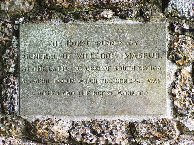 "The horse ridden by General de Villebois Mareuil at the battle of Boshof, South Africa 5th April 1900 in which the General was killed and the horse wounded. Villebois. Brought to England by Major General Lord Chesham KCB., in 1900 died 5th February 1911"