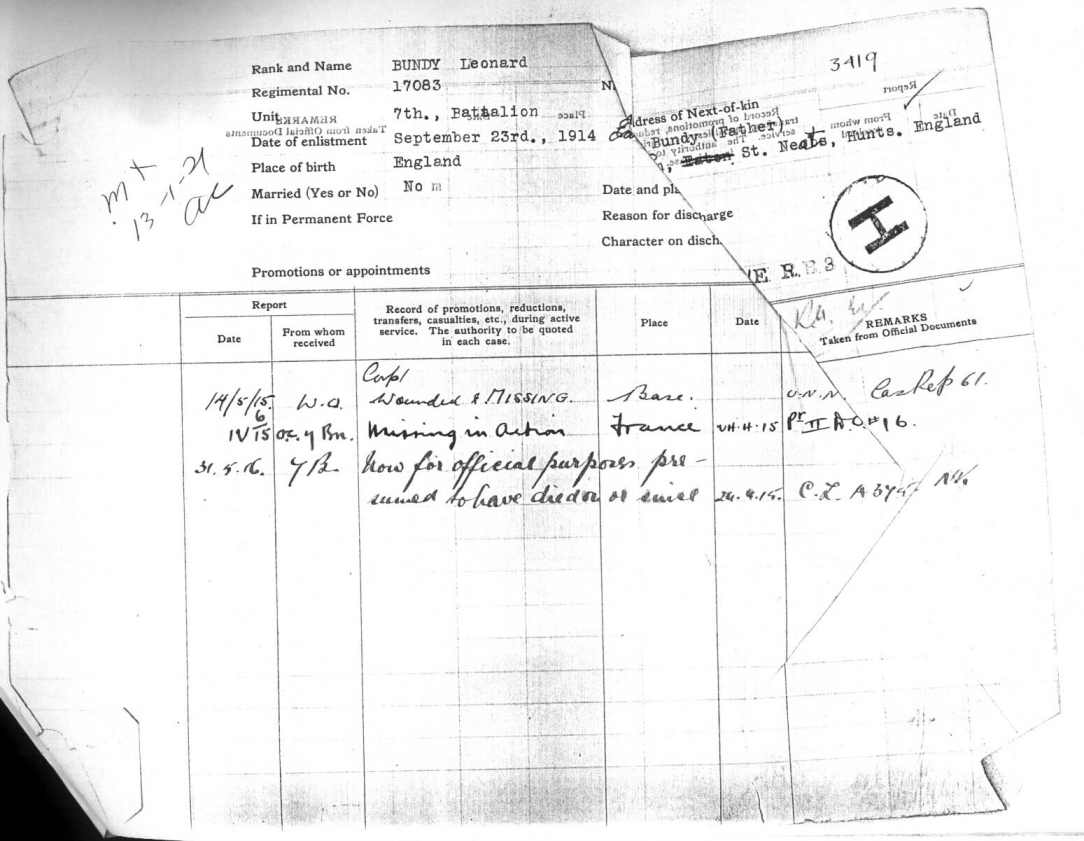 The photographs of the papers kindly supplied by Jim Bundy Note: The full versions are very large and may take a very long time to load. This is a copy of the alternative casualty form issued for Leonard Bundy. 16 January 2001