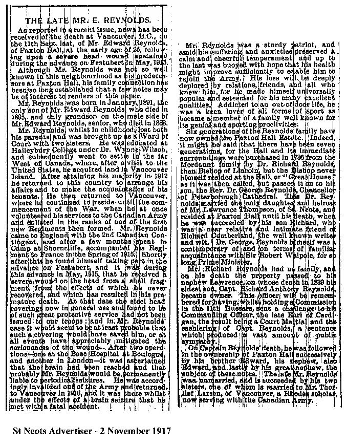 of Ford House, St. Neots, Hunts. Buried in RIBECOURT BRITISH CEMETERY,