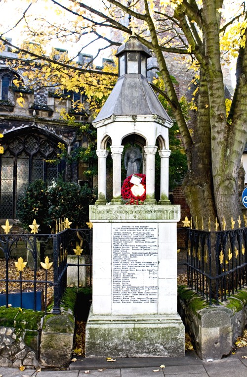 The Huntingdon Boer War memorial is on the corner of George Street and High Street, next to All Saints Church Yard in Huntingdon. It takes the form of a square base supporting six columns with hexagonal arches and a hexagonal roof with a lantern on top with a glit cross. Under the roff is a figure of St George which is a scale model of a statue by Donatello in Florence. There are 38 names listed by surname, rank, Regiment and forename. The memorial was unveiled on 23rd October, 1903, by Field Marshalll Lord Grenfell. THe monies to build the memorial were raised by public subscription; the architects were Mr Edgar W Davies and Mr Alex J S Scott-Gatty and the sculptor Signor Gulielmo Tosi. Places of residence listed below were taken from the reports of the unveiling ceremony in the 'Hunts Post' and 'Hunts County News' of 31st October, 1903. There are further plaques within All Saints (3 names) and St Mary's (3 names) Churches whose details have been added here. The names have been sorted into alphabetical order here for ease of reading and research.