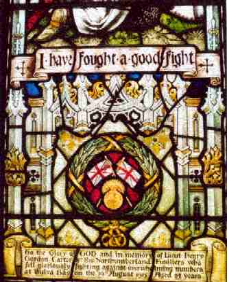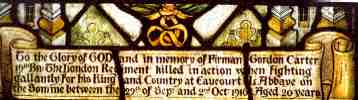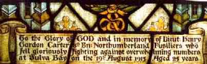 (1) Lieutenant Henry Gordon Carter 8th Northumberland Fusiliers "who fell gloriously fighting against overwhelming odds at Suvla Bay on the 19th August 1915. Aged 25 years." Commemorated on the Helles Memorial, Gallipoli, Turkey - and by this window in Kimbolton church.