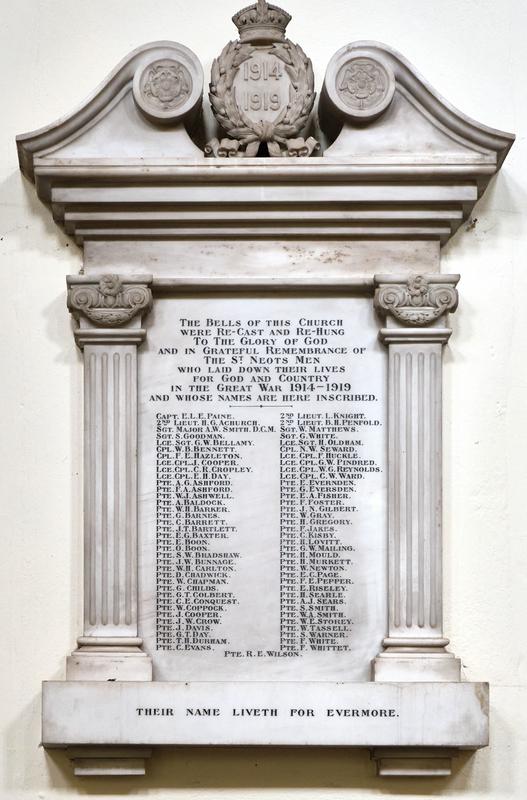 The memorial is within the St Mary The Virgin Church, Church Street, St Neots, Huntingdon. The memorial is in the form of the church bells with an associated dedicatory tablets. There are 73 names listed for World War 1 only. The memorial was dedicated October 1919 by the Bishop of Ely. Most names appear on the town memorial but others do not.