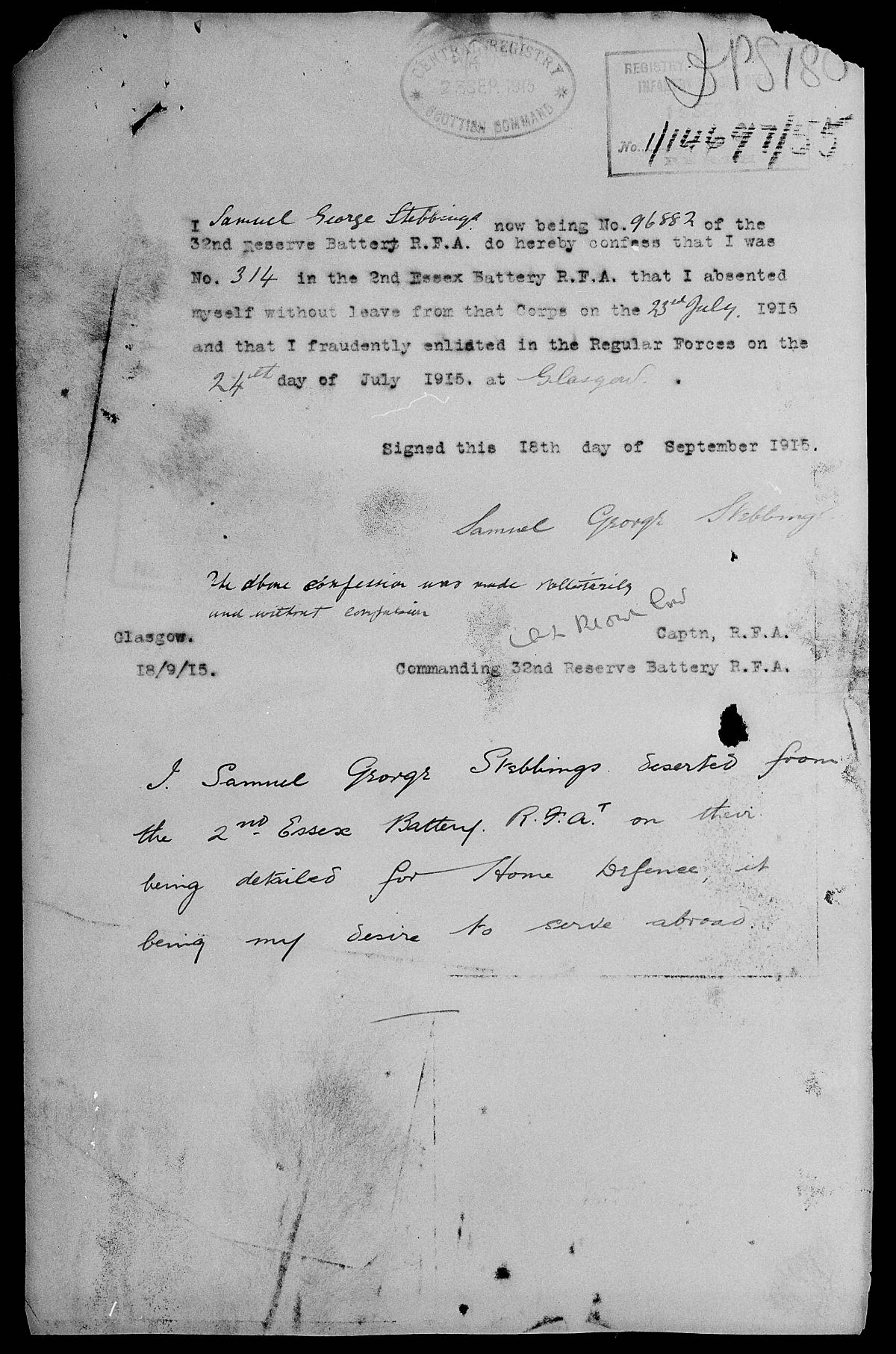 Clerk, Romford - Acting Bombardier 314, "C" Battery, 1st/2nd East Anglian, 271st Brigade, Royal Field Artillery. Died from a Hepatic abcess and Peritonitis (Acute) in 26th Stationary Hospital, Ismalia, 15 October 1916. Aged 24. Born Romford, Essex. Resident Romford, Essex. Son of Mrs. Clara Stebbings, of 6, Clifton Road, Romford, Essex. Joined Great Eastern Railway February 1907. Attested 12 April 1912 in Romford, aged 20 years 4 months, a Clerk with G.E.R. at 6 Clifton Road, unmarried, height 5 feet 9 inches, chest 36½ inches, re-enlisted for short term 24 July 1915 in Glasgow, resident 6 Clifton Road, Romford, aged 23 years 8 months, a Clerk, unmarried, height 5 feet 8½ inches, chest 37½ inches, 146 lbs, dark hair, brown eyes, rather sallow complexion, enlistement deemed fraudulent 18 September 1915, served on his 1912 enlistment. Buried in SUEZ WAR MEMORIAL CEMETERY, Egypt. Plot D. Grave 72.