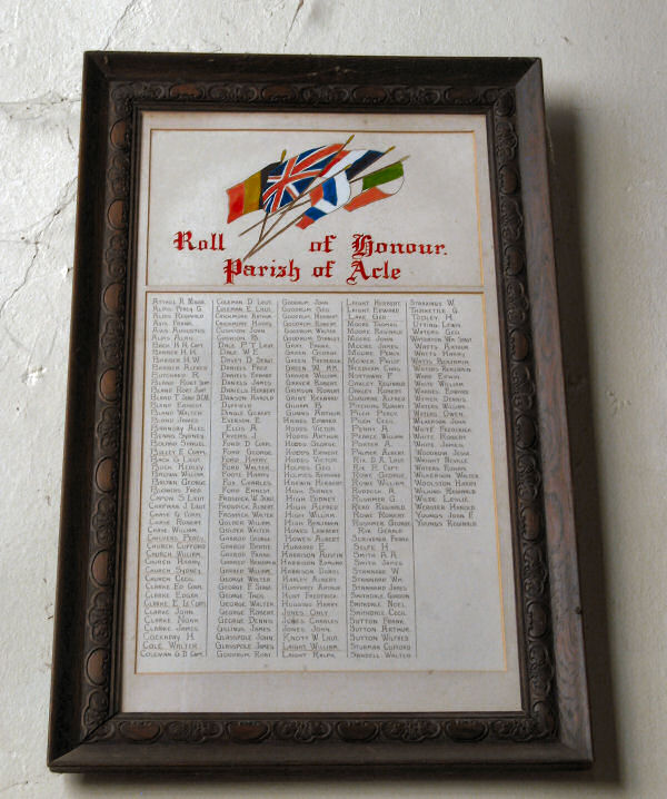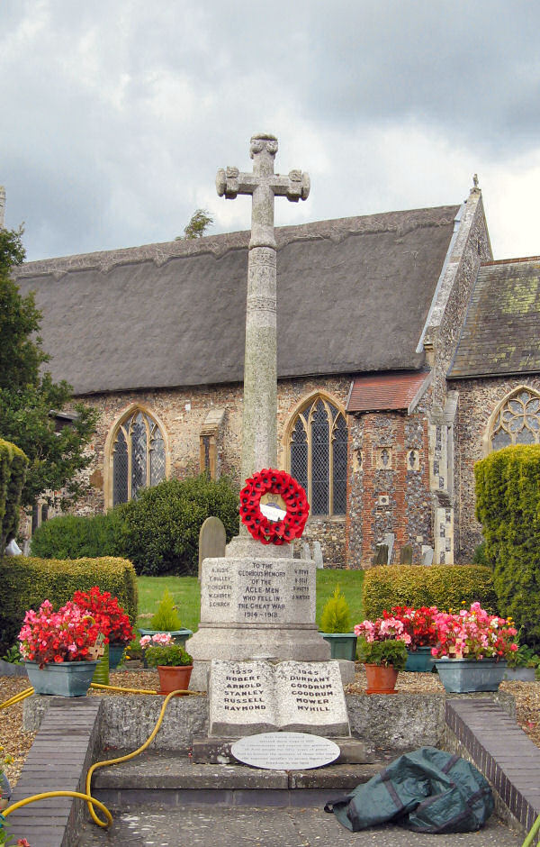 Twenty-eight men of Acle have fallen in the war; and they have been commemorated in a way that not only honours the dead, but speaks well for the practical good sense of the parishioners. The cross stands ten and a half feet high, the shaft resting on an octagonal base. It occupies a well elevated part of the church yard overlooking the Norwich and Yarmouth main road, at a point which hitherto has been rather dangerous; but now, at the instance of the Churchyard Improvement Committee, has been made much less so.