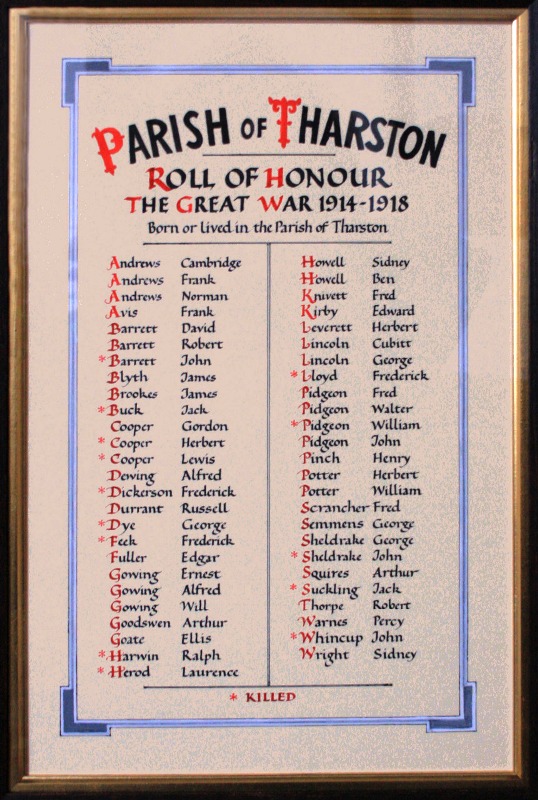The Tharston Roll of Honour containing those who died and those who survived can be found in St Mary's Church, Tharston. It takes the form of a handwritten Roll of Honour which is in a frame. Those marked with a were killed.
