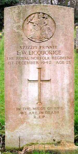 5772219 Private, 1st Battalion, The Royal Norfolk Regiment. Died 1st December 1942, age 25. Son of John James Licquorice and Hilda Licquorice, of Walpole Highway; husband of Joan Agnes Licquorice, of Walpole Highway. Buried in Walpole St Peter Churchyard. Row 4. Grave 32.