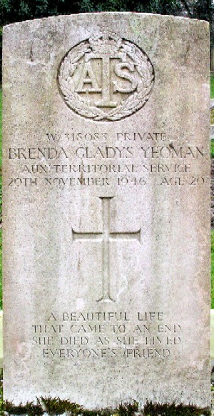 W/318083 Private, Auxiliary Territorial Service. Died 20th November 1946, age 20. Daughter of Clare and Gladys May Yeoman, of Walpole Highway. Buried in Walpole St Peter Churchyard. Row 8. Grave 38.