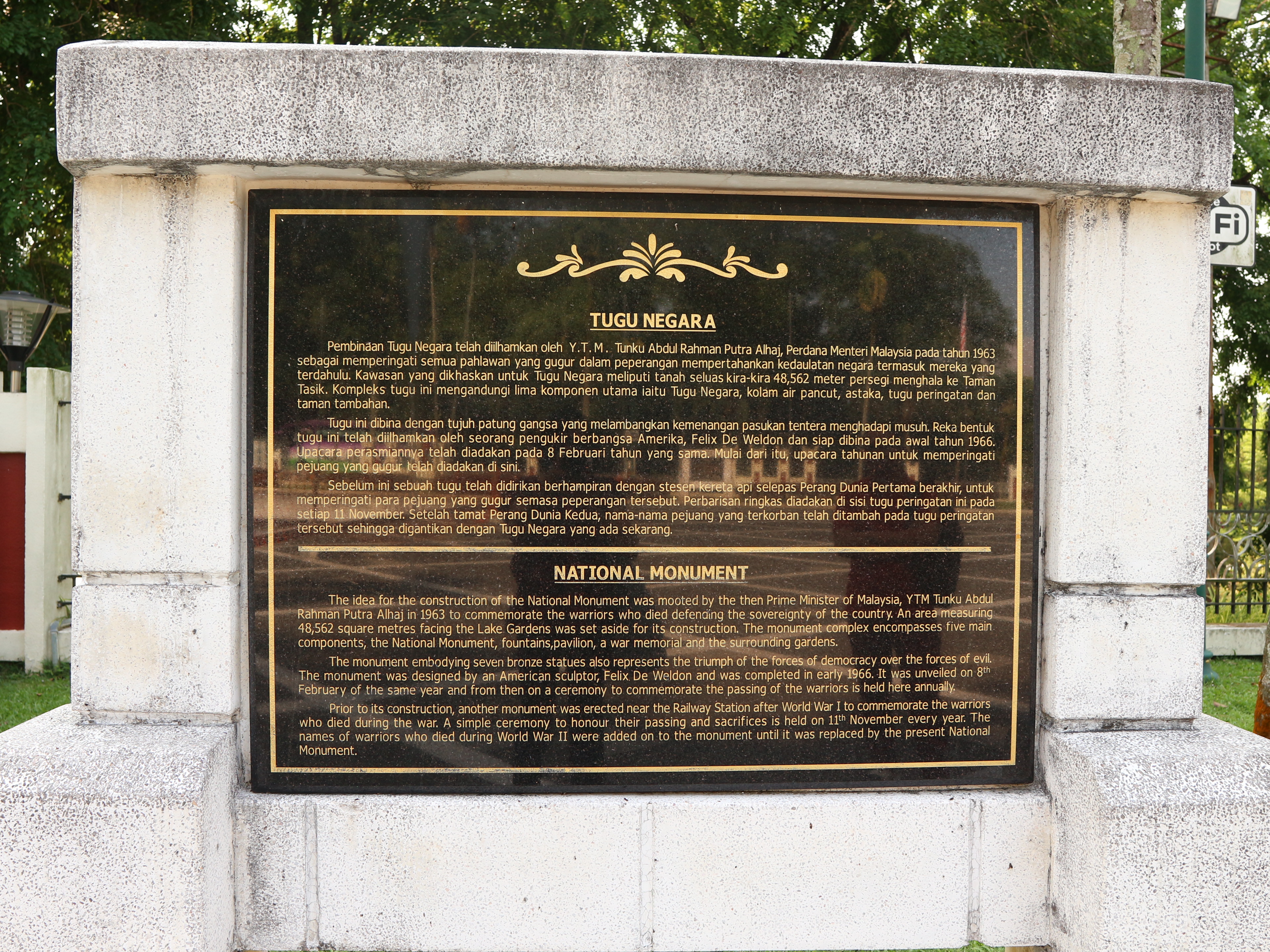 The Tugu Negara is a national monument that commemorates those who died in Malaysia's struggle for freedom, principally against the Japanese occupation during World War II and the Malayan Emergency, which lasted from 1948 until 1960. It is located in the Federal capital, Kuala Lumpur. The Malaysian Houses of Parliament is situated near the monument. The World War 1 cenotaph sits in the same area. It is the world's tallest bronze freestanding sculpture grouping. Until 2010, on 31 July on Warriors' Day, the Yang di-Pertuan Agong, the Prime Minister, and the heads of the Malaysian Armed Forces and the Royal Malaysia Police pay their respects to the fallen heroes by laying garlands at the monument. Warriors' Day is now commemorated on Merdeka Square, after ultra-conservative religious bureaucrats declared the sculpture to be idolatrous. In 2023 when visited it was under renovation. The concept of a national monument was mooted by Malaysia's first Prime Minister Tunku Abdul Rahman, who was inspired by the Marine Corps War Memorial during his visit to the United States in October 1960, before personally meeting Felix de Weldon for a favour to design the monument. Felix de Weldon contributed in creating Malaysia's Tugu Negara (National Monument). He also designed the Iwo Jima Memorial located at Arlington, Washington DC. The Tugu Negara was completed and officially opened on 8 February 1966, by Ismail Nasiruddin of Terengganu, then Yang di-Pertuan Agong. It was proclaimed a memorial park dedicated to the 11,000 people who died during the 12-year Malayan Emergency (1948–1960). Thereafter, a wreath-laying ceremony takes place at the monument every 31 July on Warriors Day. De Weldon was later conferred with the title Tan Sri, the Malaysian equivalent of a high-ranking knighthood.