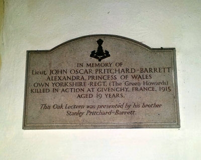 | PRITCHARD-BARRETT | John Oscar | Lieutenant, Alexandra, 3rd Battalion. attached to 2nd Battalion, Princess of Wales's Own (Yorkshire Regiment, The Green Howards). Killed in action at Givenchy, France, 15 June 1915. Aged 19. Brother of Stanley Pritchard-Barrett. No known grave. Commemorated on LE TOURET MEMORIAL, Pas de Calais, France. Panel 12.