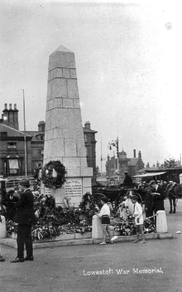 "This souvenir of the Lowestoft War Memorial is intended to serve as a tangible record of the names of our heroic dead. During the Great War the toll on human life paid by this town was, unhappily, so heavy that the names of the fallen are too numerous to permit of their inscription upon the Monument which has been erected. A list of those who fought and fell has been placed within it, and a similar list is preserved at the Town Hall. It was thought, however, that this Souvenir would register their names in a more accessible manner, and that those who had lost their loved ones would value and preserve this little token of the sorrow that has fallen upon them; that it would serve in their homes, in like manner as the Monument serves in the open, to show that their fellow citizens share in their sorrow, and reverence and respect the memory of the men who died so greatly".